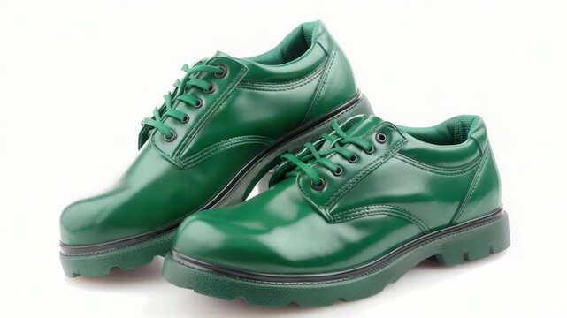 A pair of green shoes sit alone on a clean white surface