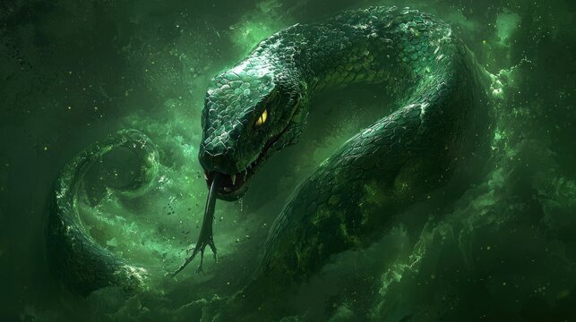 Chinese new year (Snake year) background. Glowing green snake with a mystical aura against a dark background.