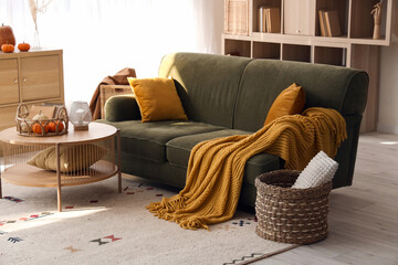 Mock up poster frame in modern interior, green sofa in living room on white wall, 3D render