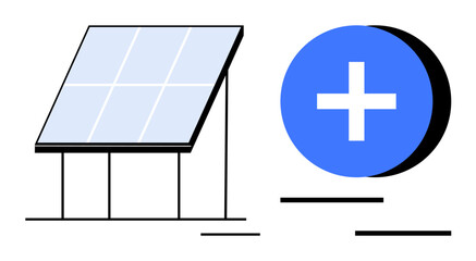 Renewable energy concept. Renewable energy with a solar panel and circular add symbol promoting sustainability. Renewable energy for green solutions, technology, and environment. Usage renewable