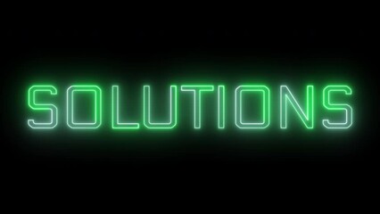 Bright neon glowing green solutions sign animation on black background.