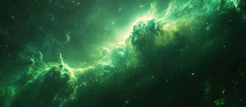 Green space nebula 3d render. Galaxy sky background. Fantasy abstract green texture of the universe. Dark cloud of cosmos. Constellation of stars. Outer space. Celestial starry milky way. Solar gas