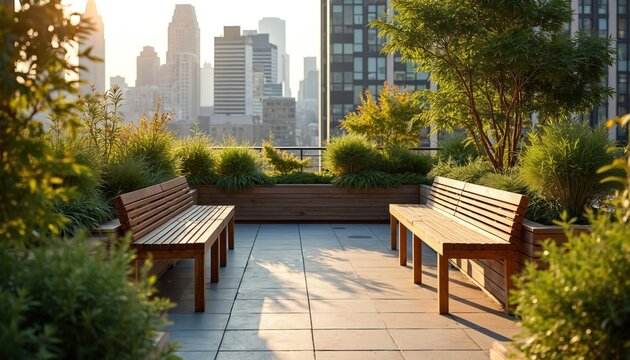 Urban rooftop green space with wooden benches and lush plants. City skyline forms backdrop. Offers serene relaxation area in urban environment. Sustainable plants design.