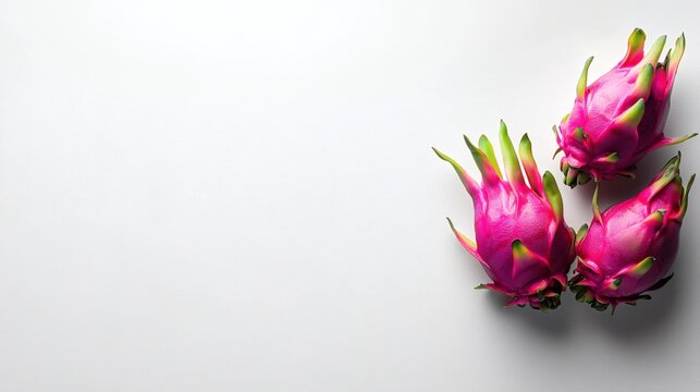Dragon fruit with vivid pink skin and green spikes on a white background
