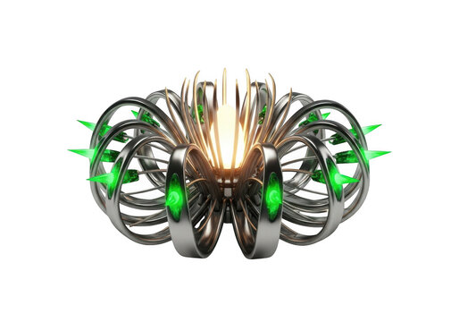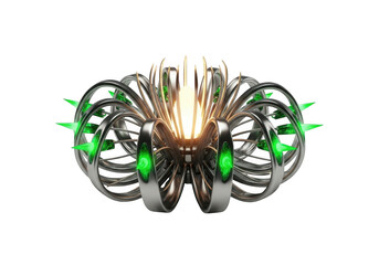 Futuristic mechanical orb with glowing green spikes isolated on transparent background