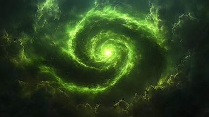 Futuristic glowing green spiral energy pattern on a dark background, creating a dynamic and mystical visual effect, ideal for sci-fi, technology, energy, and digital art backgrounds and creative proje