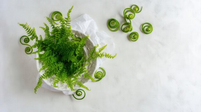 Fresh fern leaves with coiled green spirals on white background isolated. Generative AI
