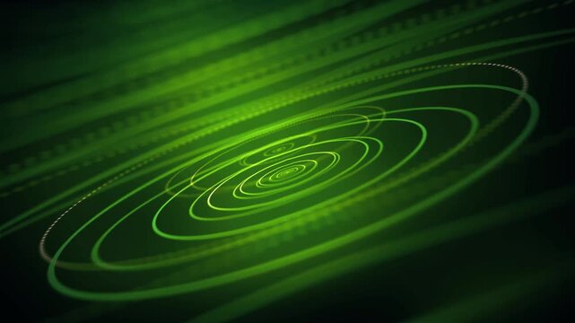 Abstract green spirals rotate dynamically on dark digital background