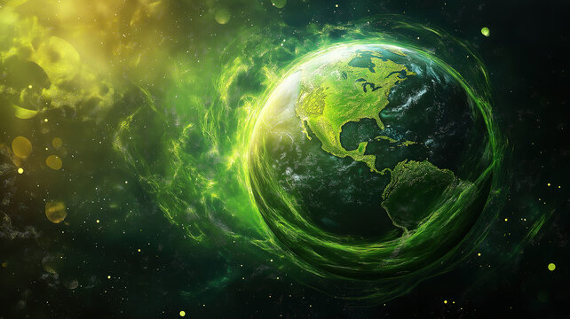 Bright green spirals encircling Earth showcasing the power of renewable energy and sustainability