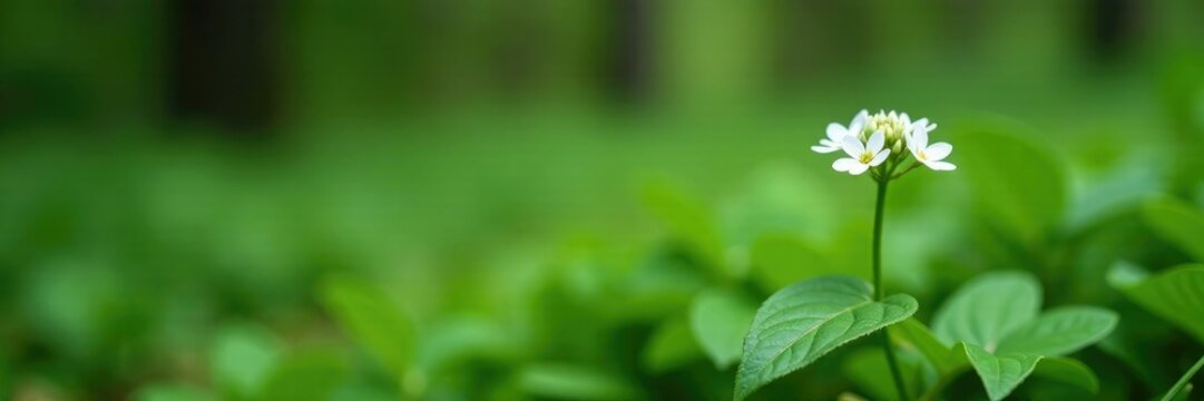 Stellaria holostea blooms with small white flowers on a green stem amidst the forest undergrowth, stellaria, nature, green