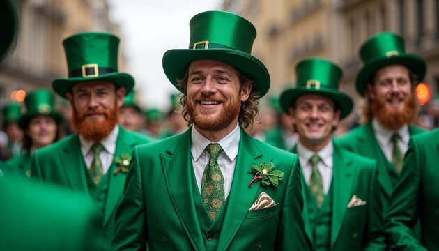Three leprechauns in green suits and hats marching and playing musical instruments.