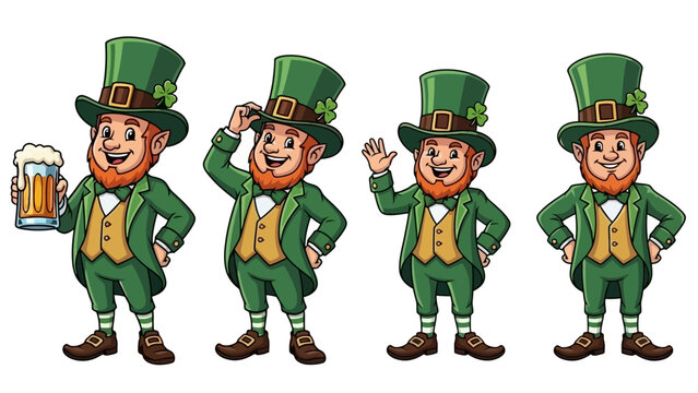 Cartoon leprechauns in green suits holding pots of gold coins  smiling and happy characters