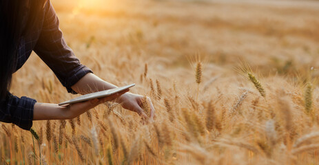 Farmer using digital tablet computer and modern interface icons, Business agriculture technology concept.