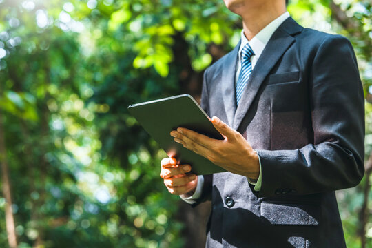 Business man using tablet to analyze ESG concept ,Sustainable development goal (SDGs) Ideas Globe Glass energy-based green business can limit climate change and global warming.