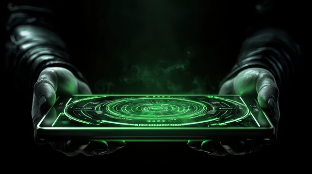 Frustrated man examines a vibrant green tablet, his expression reflecting digital dilemma or technical glitch.