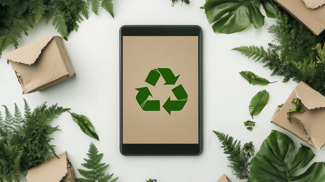 Hands holding green tablet against foliage backdrop, sunlight adds warmth. Serene scene captured in tranquil setting.