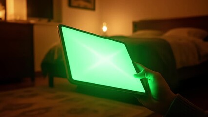 A hand holding a glowing green tablet in a cozy bedroom setting.
