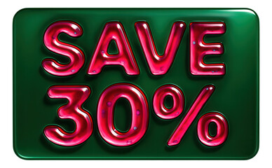Glossy green tag sticker with SAVE 30% discount in vibrant lettering, attention-grabbing retail promo offer on transparent background.