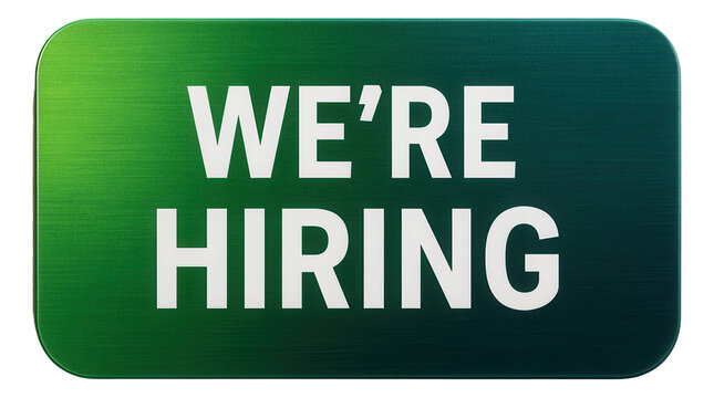 Glossy green tag sticker with HIRING NOW message in bold metallic letters, attention-grabbing promo offer on transparent background.