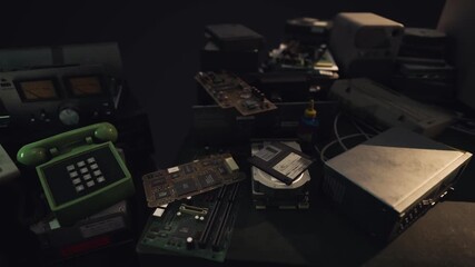 A collection of vintage electronic parts and devices is displayed on a cluttered workbench. Various circuit boards, tools, and an old green telephone are visible in low light.