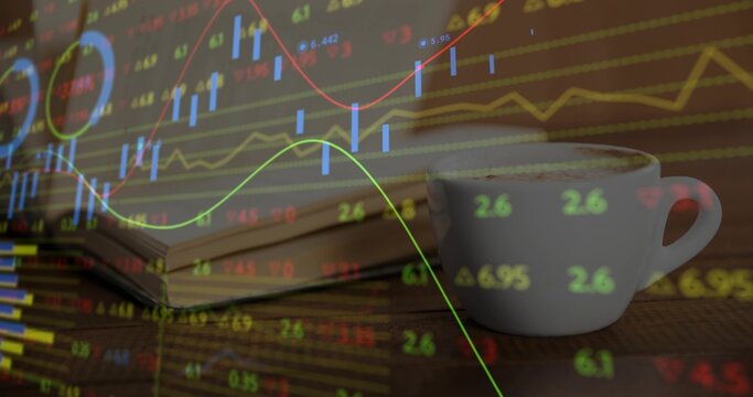Displaying chart showing candlestick bars and green line on trading app with tickers and eco icons