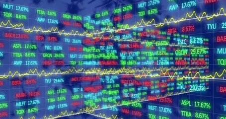Opening orange world map showing scrolling tickers updating green red percents displaying trends