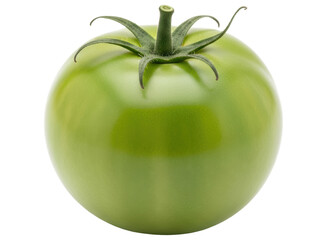 Green Tomato. A single green tomato is displayed prominently on a clean white background. The tomato is unripe, with a vibrant green hue and a smooth skin. on White or PNG Transparent Background.