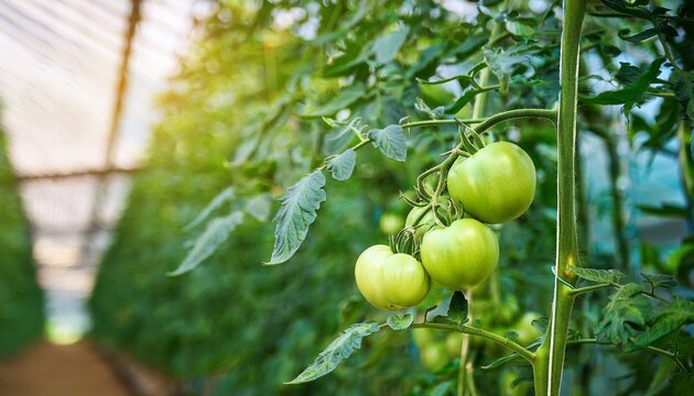 farmland with green tomato plants growing in rows, tractor in the background, landscape