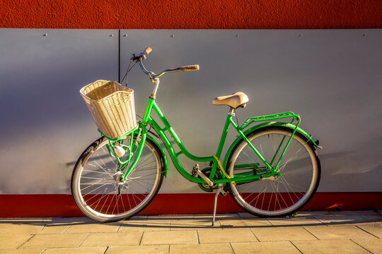 Green bike with basket on a sidewalk in Munich promoting sustainability and green transport