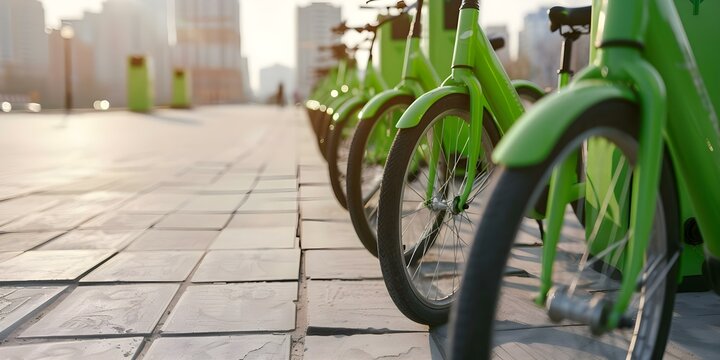 Public electric bike charging station promoting green transport in vibrant cityscape. Concept Green Transportation, Electric Bikes, Cityscape, Charging Station, Sustainable Living