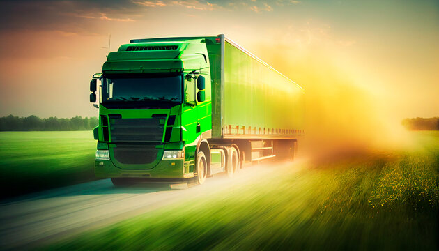 Green transport truck driving through a blurred green meadow at sunrise. Generative AI