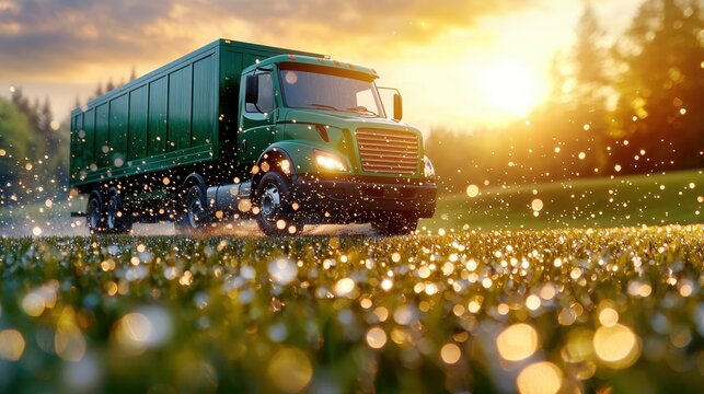 As the green transport truck cruised through the blurred meadow at sunrise, the rays of sun illuminated the dewdrops on the lush grass