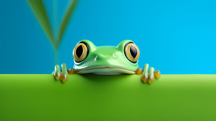 A cute green tree frog peeks out from the edge of a solid color background