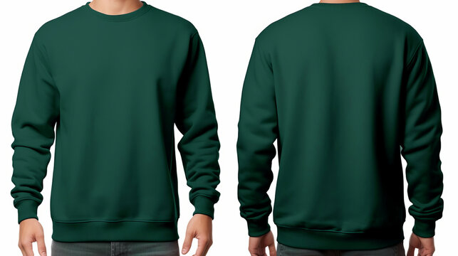 A man is wearing a dark green sweatshirt, and t-shirt with full sleeves, both on the front and back sides. mockup