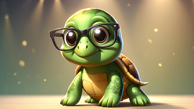 Cute little green turtle with glasses in front of studio background. Generative AI