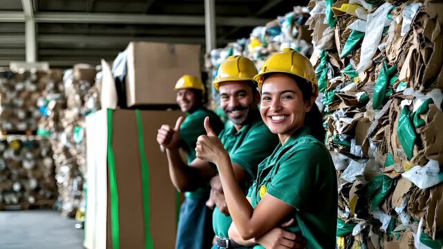 Recycling. Environment conservation. Waste management. Awarehouse workers in green uniforms and yellow hard hats giving thumbs up amidst a warehouse filled with cardboard boxes.