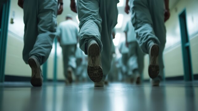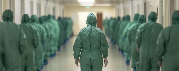 Healthcare workers in green uniforms walking in a hospital corridor.