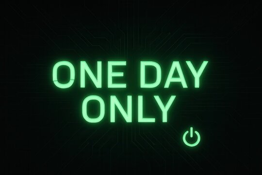 Neon green "One Day Only" text with a power icon on a dark circuit-patterned background, suggesting urgency and limited-time offers.
