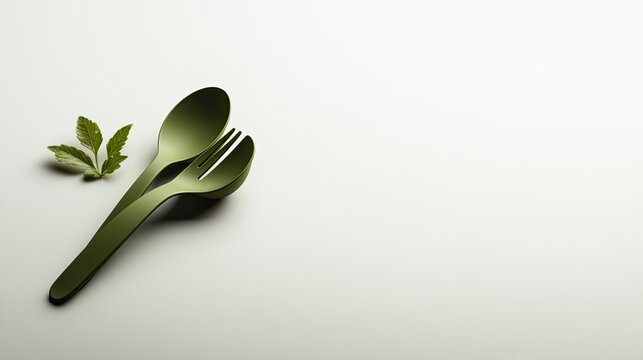 Stylish green utensils and fresh mint leaves on a clean, minimalist background ideal for culinary and dining concepts