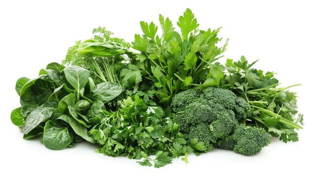 Pile of fresh green veggies on a white background