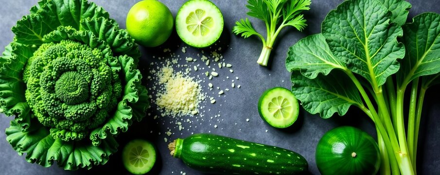 Bright green veggies and fruits are neatly placed on a vibrant lime surface, highlighting health and freshness