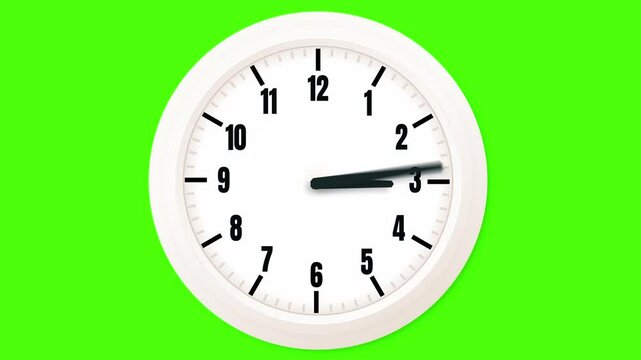 Time lapse video (looped) of a full 12-hour rotation of the hands of a classic black and white wall clock against a green screen chromakey background.