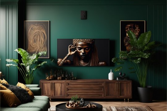 An example of renovation for a Living room with a huge wall-mounted TV, a neat wooden bedside table, green walls, parquet flooring, a comfortable sofa, time spent reading an interesting book. AI