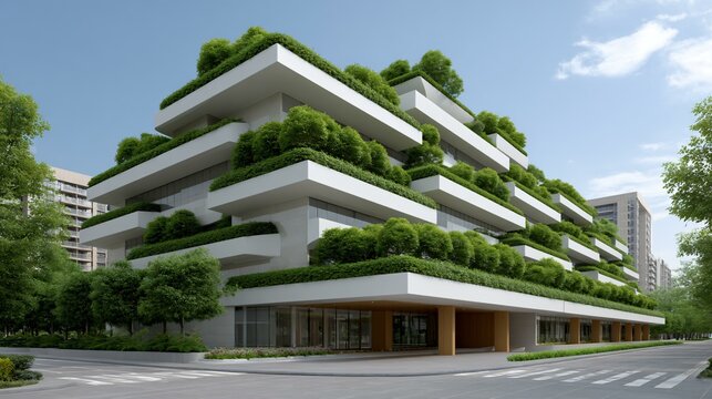 A futuristic urban downtown where skyscrapers have green walls and rooftop gardens, blending nature and technology in a modern eco-city