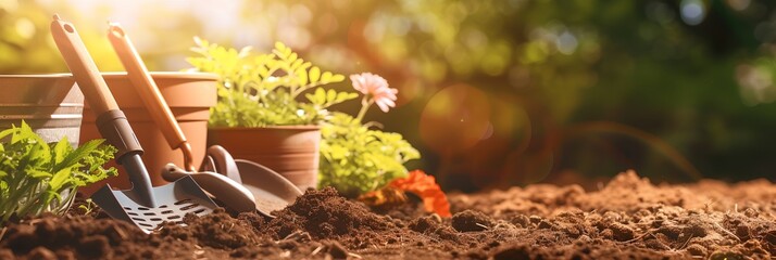 Gardening tools for gardener, green plants at spring day.