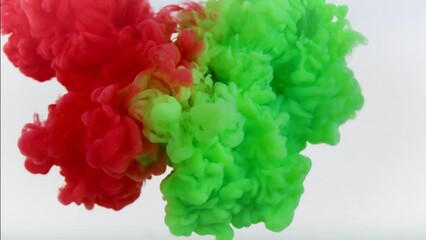 Abstract background. Colored paint drips into water, forms red and green swirls.