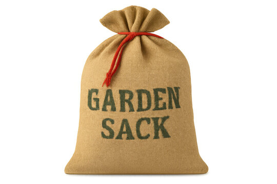 Full closed garden sack standing upright, featuring a vibrant red tie and green writing, set against a transparent background
