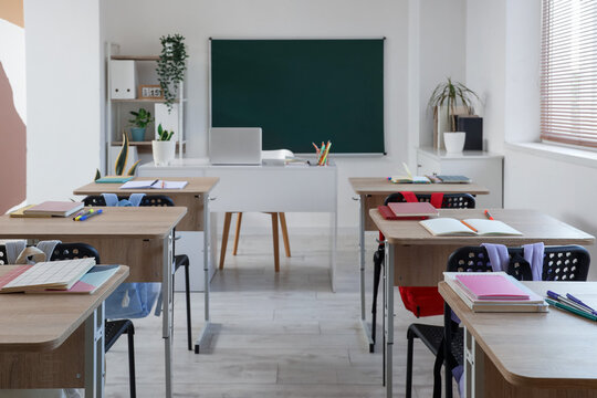 Interior of empty classroom with school desks and greenboard