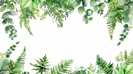 Vibrant Watercolor Greenery border clipart, a harmonious blend of ferns and eucalyptus, creating a lively frame, isolated on white, perfect for invitations