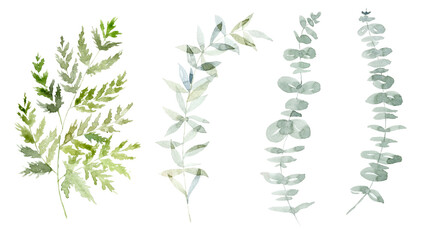 Set of green Branches with Eucalyptus. Watercolor Illustration.